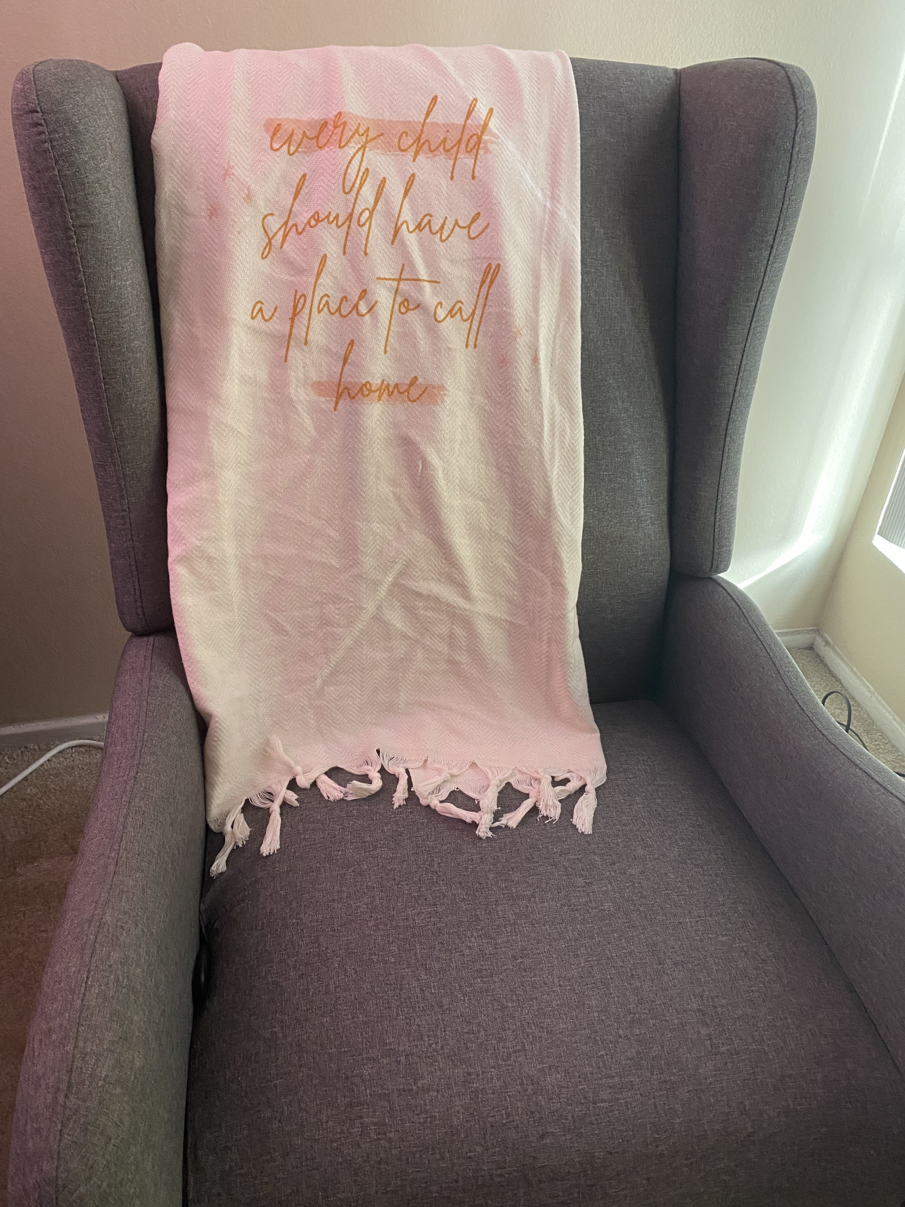 My crib is empty, and I don’t even know if the mermaid sheets I have on it now are the sheets my next baby will need. My changing table sits empty, and there are no little hands trying to grasp the animals above. The bassinet is folded up in a corner and the baby carrier hangs above it, waiting to be used. Even my rocking chair is empty, although the blanket draped over it still shouts out a reminder that every child should have a place to call home.